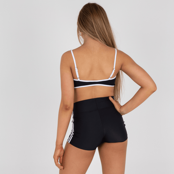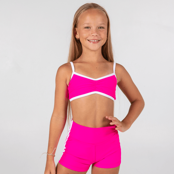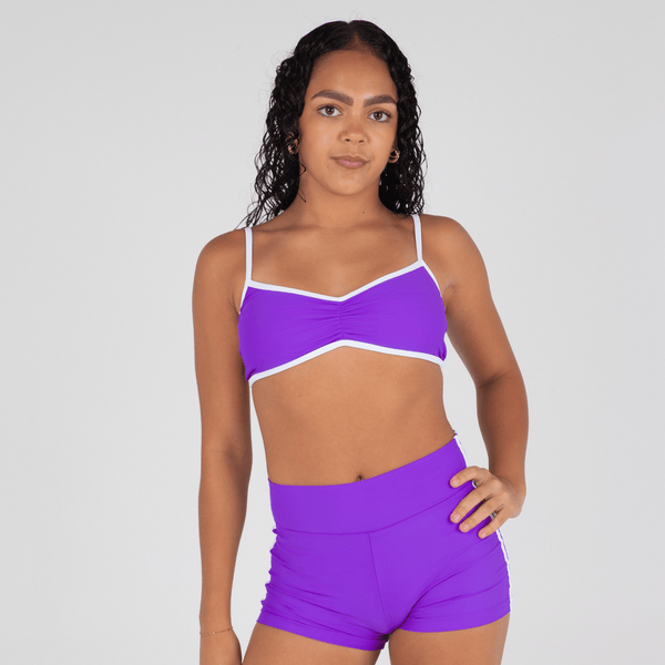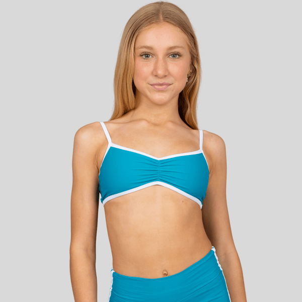 Flaunt your unique style with our Accent Crop, a bandeau crop top with two-tone design and contrast binding for a touch of personality. Adjustable straps provide a perfect fit while the rouched front adds a playful flair. Show off your fashion sense with this quirky and fun piece!