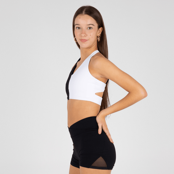 The Bougee Crop features a sleek black and white two-toned design with clip detailing at the back and a unique strap back. With a flattering scoop neck and open back, this crop top is a must-have for any fashion-forward wardrobe. Elevate your style and make a statement with this eye-catching piece.