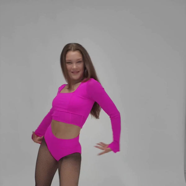 Show off your unique style with the Vision Long Sleeve Crop! Featuring a mesh bell sleeve and corset panel design, this costume comes in 3 amazing colors and a square neckline for a flattering fit. With a longer fit and removable padding insert, you'll look and feel confident in this statement piece. Pairs beautifully with our matching audition undies
